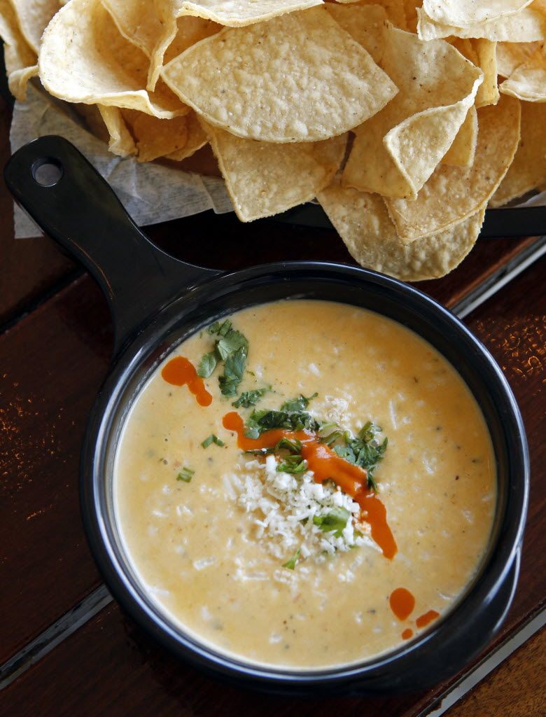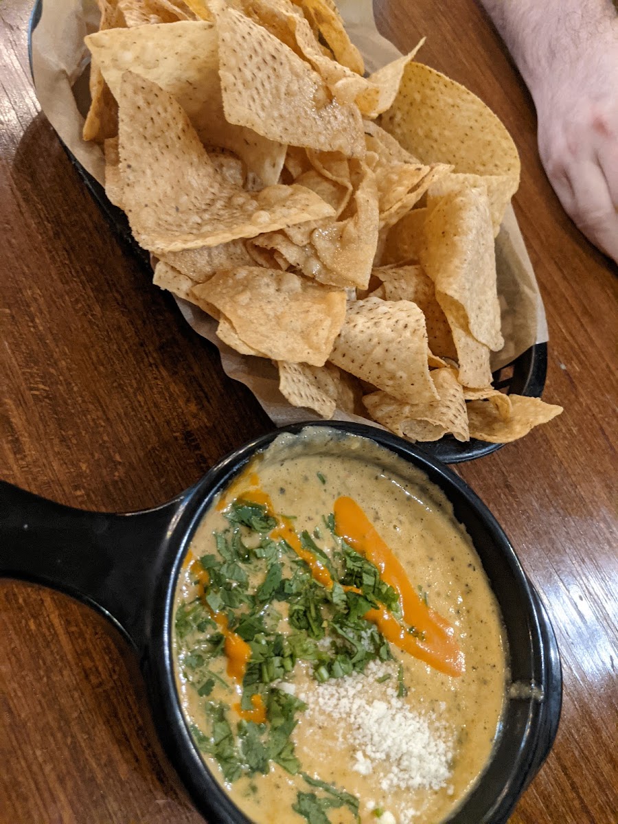 Guacamole on Right and Chips and Green Chilli Queso on Left